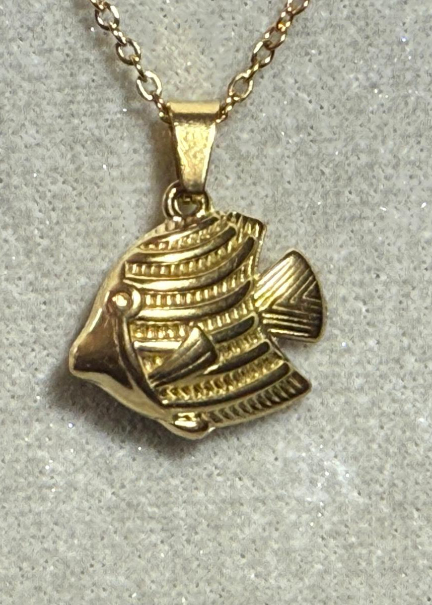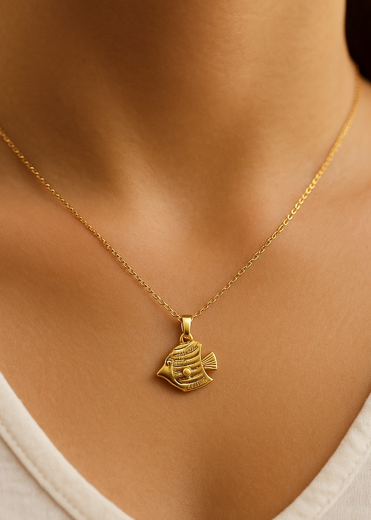 Collar dorado con cadena fina y colgante en forma de pez. Una pieza marina y luminosa, perfecta para aportar frescura y un toque original a cualquier look.