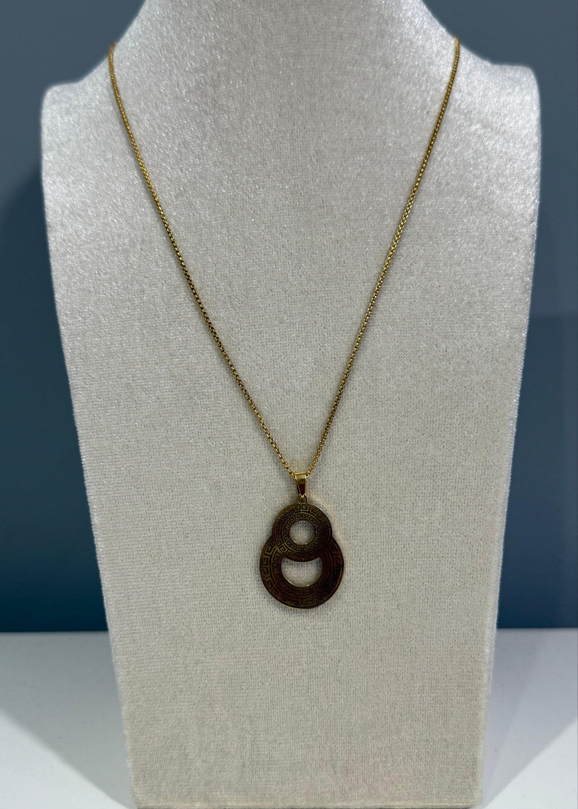 Collar de acero dorado con colgante geométrico de doble círculo grabado con patrón griego.