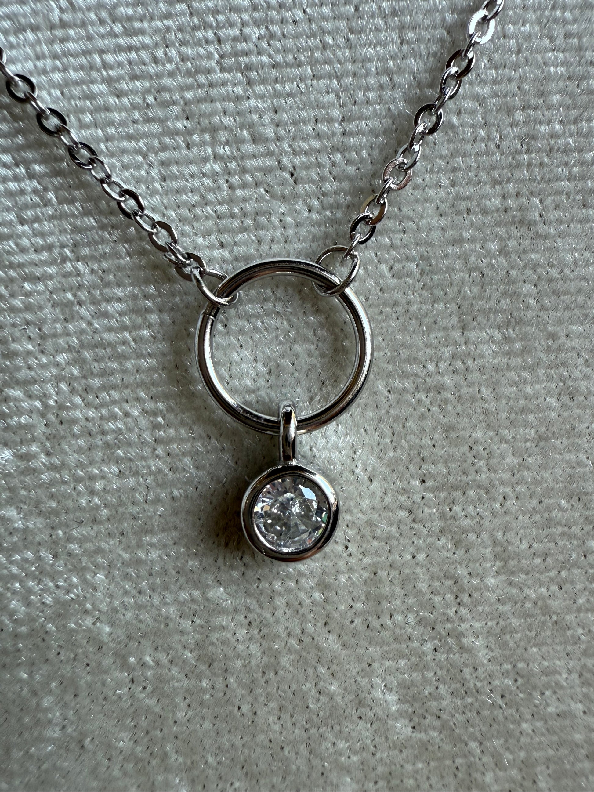Collar de Plata de Ley 925 con colgante de aro y circonita central engastada, símbolo de conexión y equilibrio.