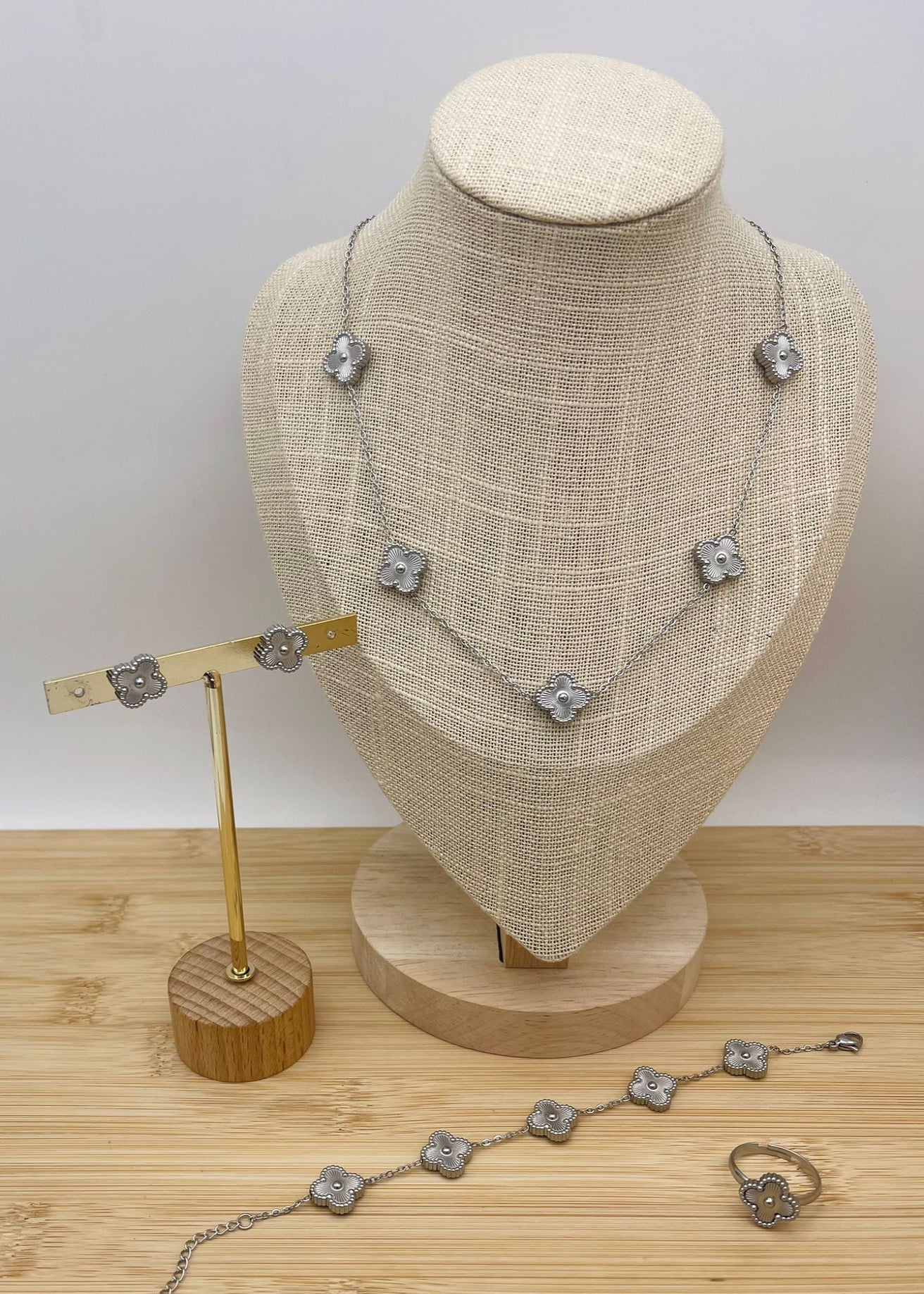 Pulsera articulada con siete flores de cuatro pétalos, cada una rodeada por un borde perlado que aporta textura y brillo. Ligera, cómoda y muy combinable, es el complemento perfecto para quienes buscan un acabado refinado sin renunciar a la simplicidad.