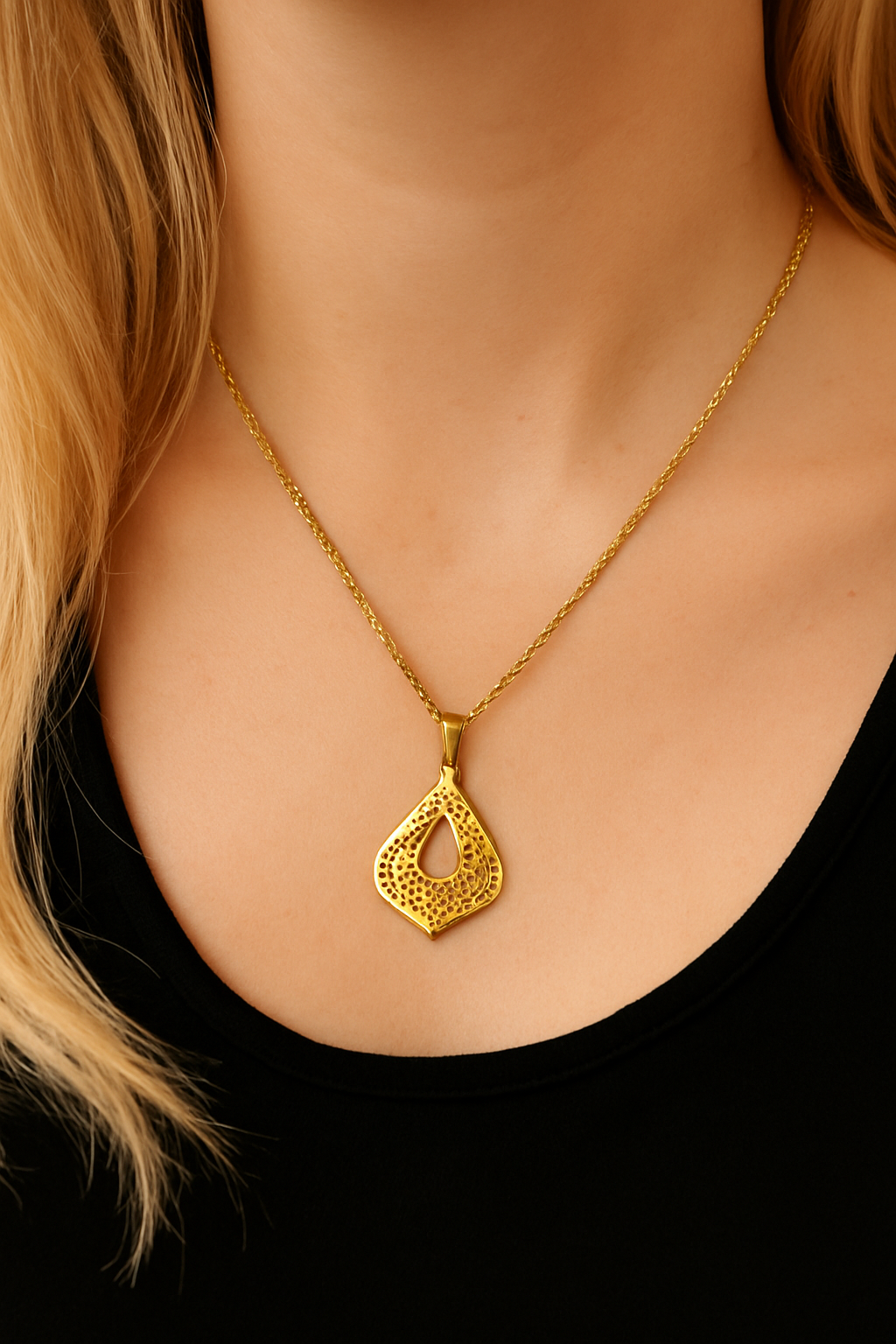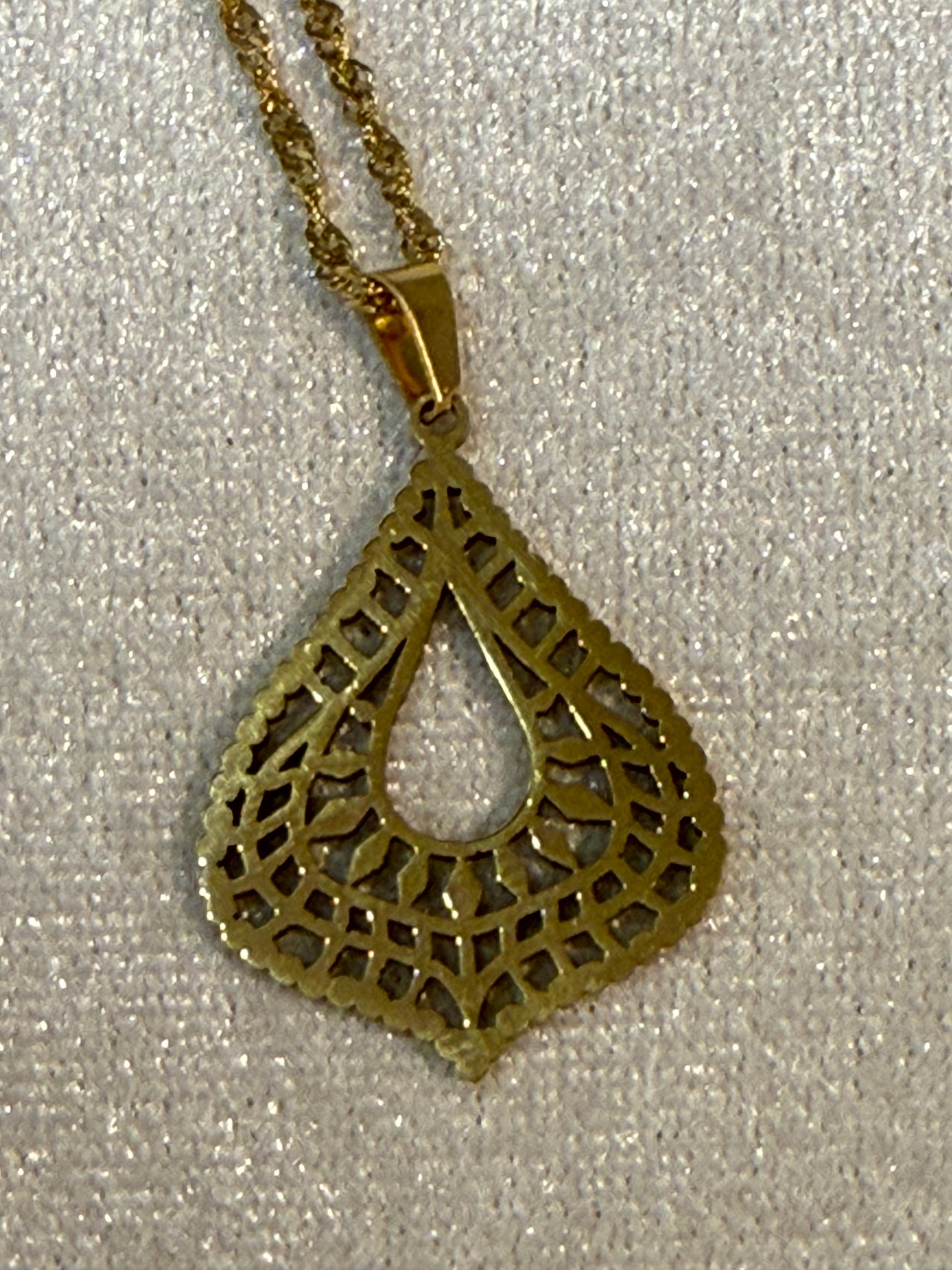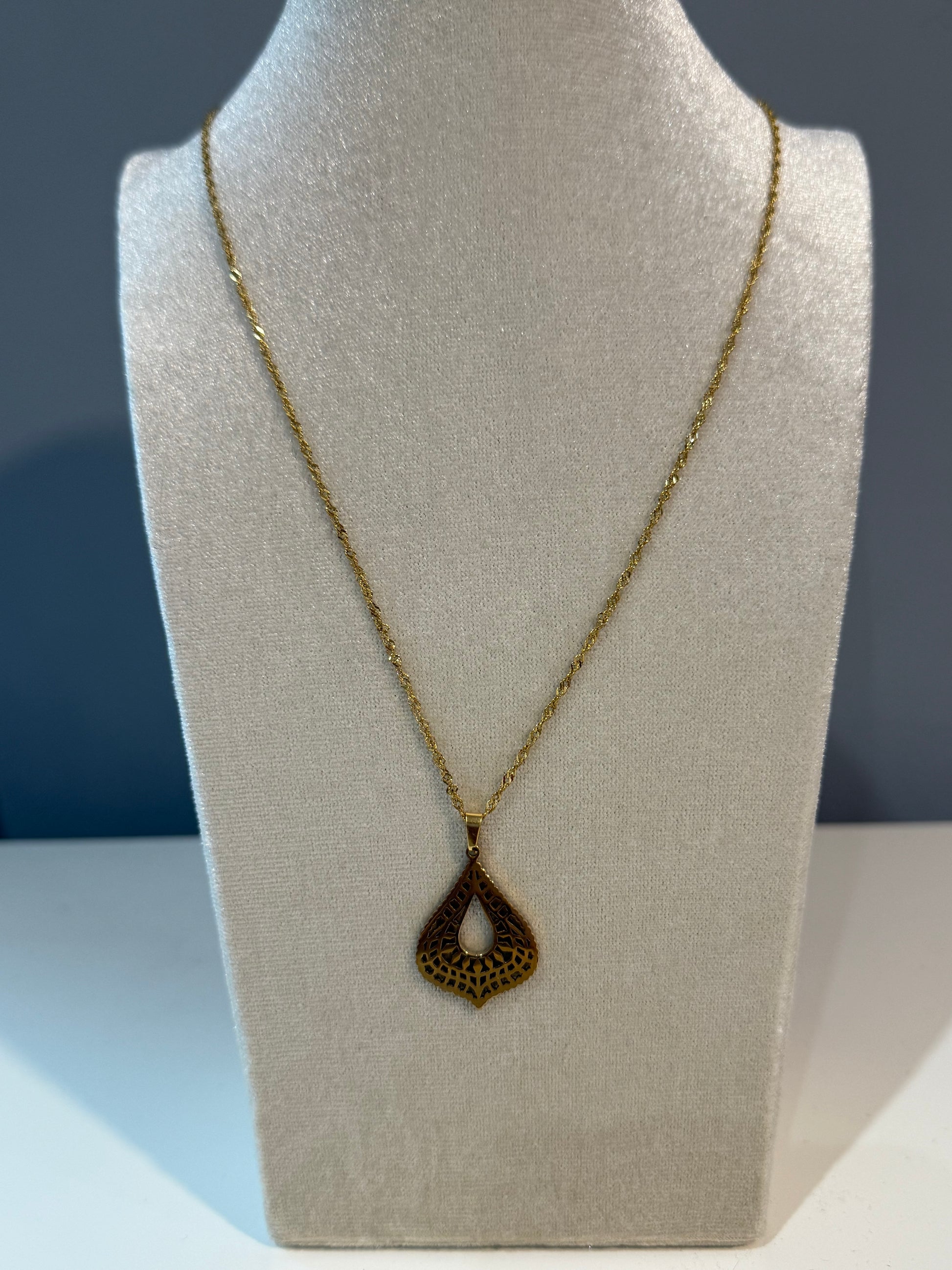 Collar de acero dorado con colgante calado en forma de lágrima invertida, de inspiración oriental.