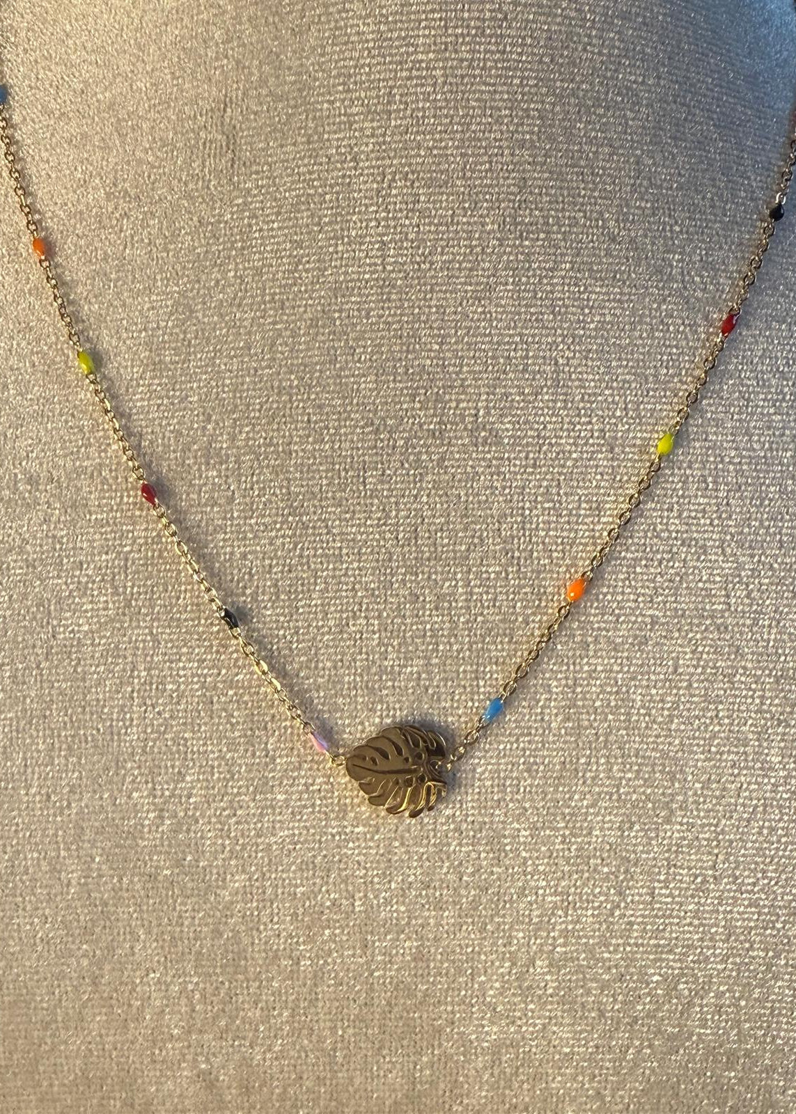 Collar de acero con detalles de color y charm central en forma de hoja de monstera. Símbolo de crecimiento y vitalidad, es una pieza fresca y alegre que aporta un aire tropical. En color oro.