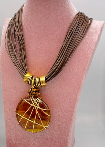 Un collar imponente y artesanal que combina tiras múltiples de cordón sedoso con un gran colgante circular elaborado en resina marmoleada. Cada pieza está envuelta en un entramado de hilo dorado que recuerda a un “nudo solar”, símbolo de energía, protección y movimiento.
