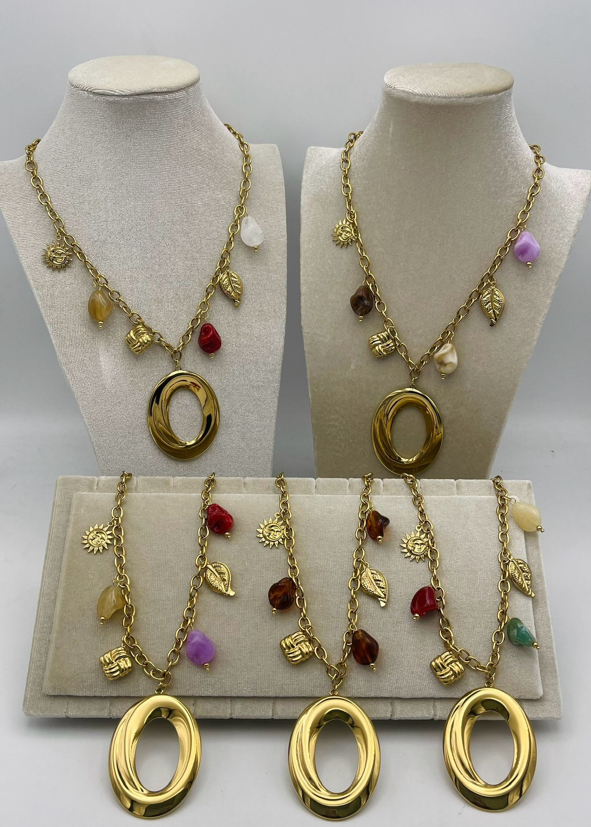 El Collar Aura Charm combina una cadena dorada de eslabón ancho con un aro central pulido que aporta fuerza, brillo y sofisticación. Cada pieza incorpora pequeños charms —hojas, flores y piedras de colores— que añaden movimiento, luz y un toque personal a cada diseño.